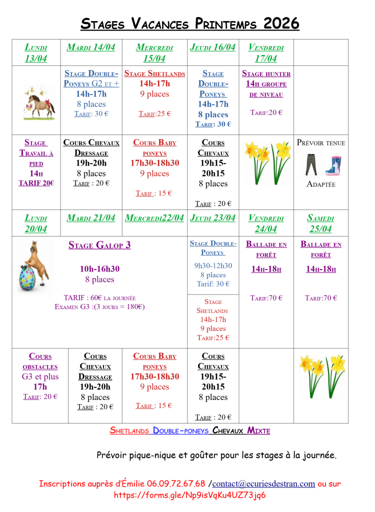 ou bien directement par retour mail ou par sms auprès d’Emilie ;)Si tu souhaites passer un galop pendant les vacances d’été, fais le nous savoir à la fin du questionnaire avec tes disponibilités afin qu’on anticipe au mieux le planning des prochaines vacances.
